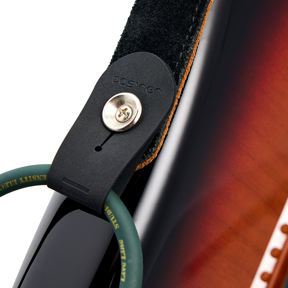 2WAY ストラップロックは、ストラップとケーブルを同時に固定するためのスマートなセキュリティツールです。本体の加工や追加のハードウェアを必要とせず、演奏中にストラップが外れてしまうことを防止すると共に、不意にプラグが抜けないようケーブルを固定することが可能です。
