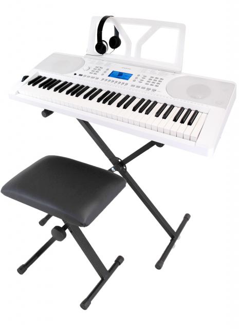 ボックス型61鍵盤のスタンダードキーボードに加えてイス、スタンド、ヘッドフォンが入ったオールインワンセットです。非常に豊富な音色やリズムに加え、音符表記が見やすいバックライト付き LCDディスプレイを搭載。プレイアビリティを演出できるピッチベンドも搭載し、より本格的な演奏を楽しめるモデルです。